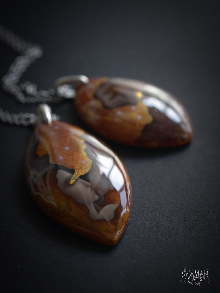 Кулон из яшмы, роспись маслом, сусальное золото. Кулон 5,8 см, цепочка 45 см.